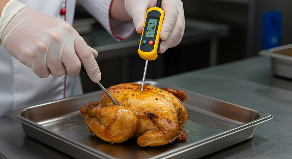 High-Res Food Safety Image – Checking Chicken Cooked Temperature