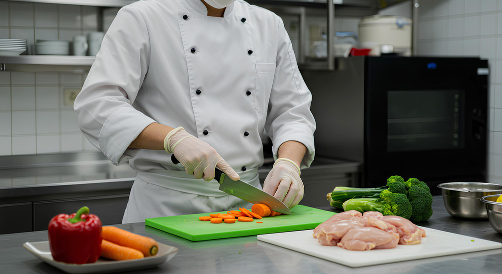 High-resolution image of a chef promoting the habit of wearing gloves while preparing food and cooking. Great for nutrition guides, kids' education, food safety posters, and awareness slides.